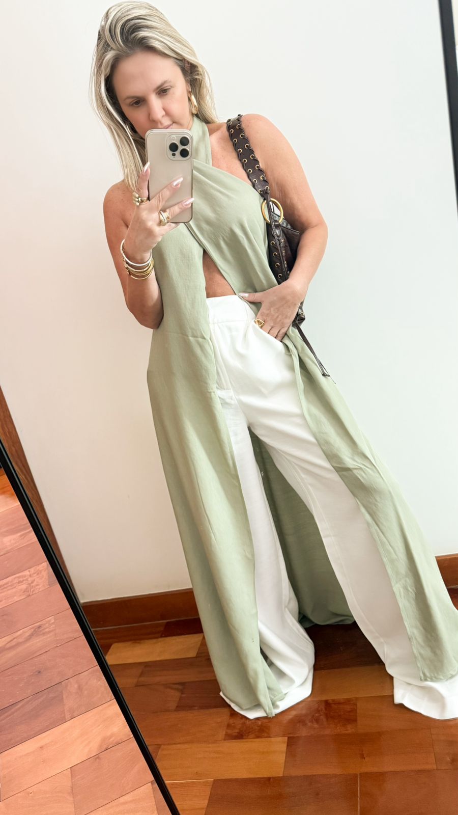A Túnica Esmeralda é a peça-chave para um visual elegante e ao mesmo tempo despojado. Com modelagem longa e fluida, ela se destaca pelo seu design moderno e versátil, perfeita para composições estilosas em climas quentes.